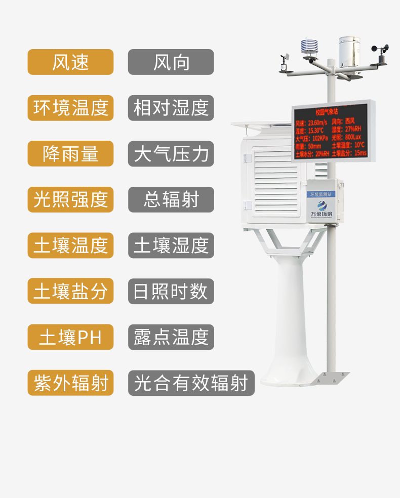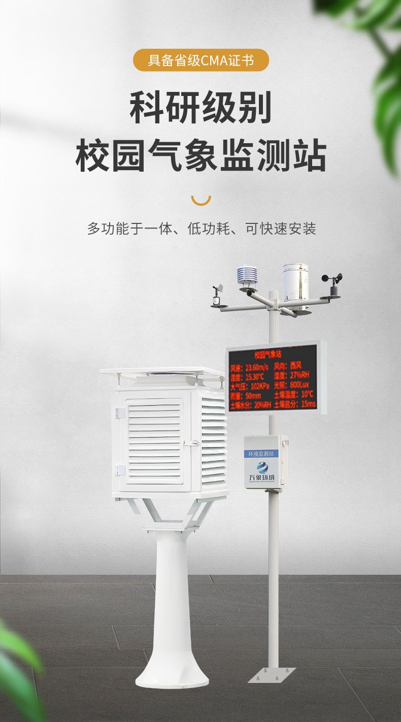 中小學校園氣象站解決方案WX-XQ4校園氣象站是一款高度集成、低功耗、可快速安裝、便于教學使用的科研級氣象站。