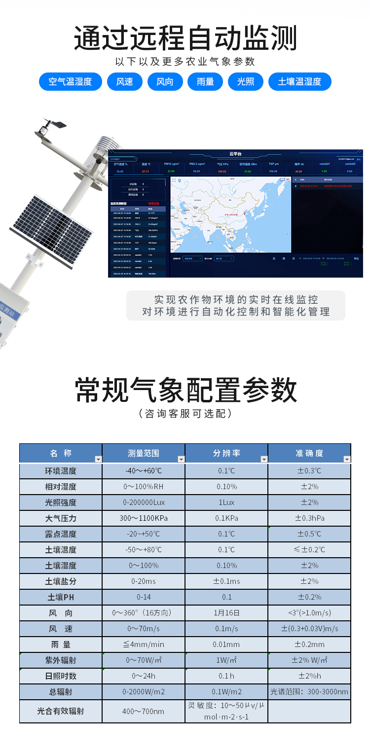 六要素自動氣象站可以監測哪些要素?可監測的要素包括:濕度、光學雨量、風速、風向、溫度、氣壓、pm2.5、pm10、CO、NO2、SO2、O3。可以根據自身的實際情況來選擇監測哪六要素,當然你想監測幾個參數都可以,都可以定制。